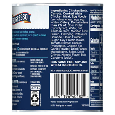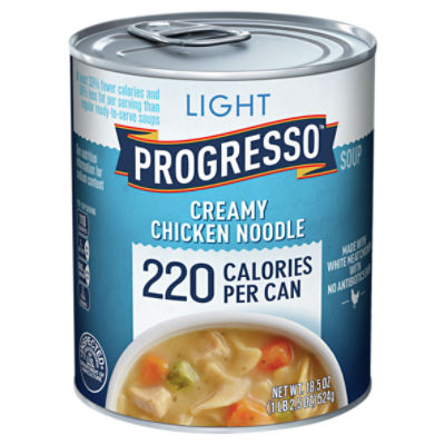 › us › enCalories in Progresso Traditional Chicken Noodle Soup ... Calorie Breakdown. Where do the calories in Progresso Traditional Chicken Noodle Soup come from? ... Progresso™ Traditional Soup at Menards® Brand Name: Progresso Features Made with all white meat chicken with no antibiotics ever Ready to serve in under 5 minutes Stock your pantry with quality canned soup Specifications Container Size 18.5 ounce Flavor Chicken and Orzo with Lemon Gluten Free No Kosher No Non GMO No Product Type Soups Shipping Dimensions 4.45 H x 3.45 W x 3.45 D