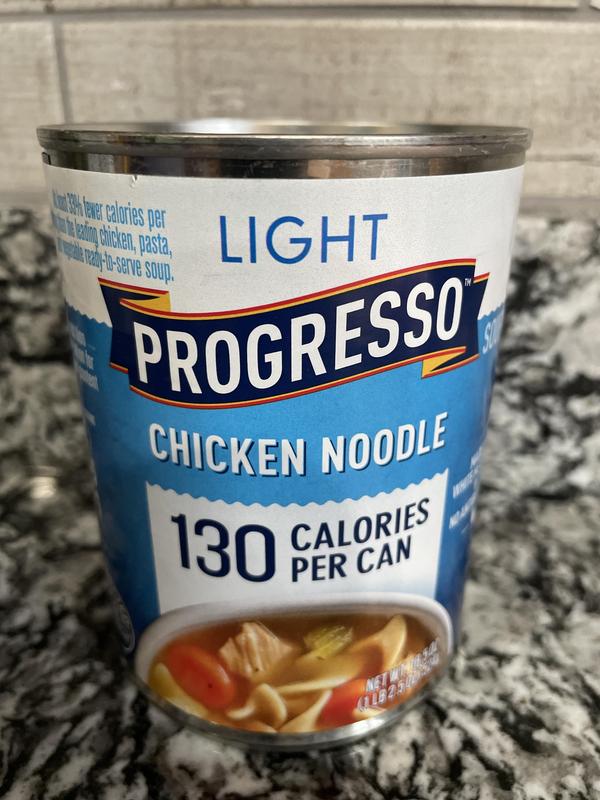 › light-chicken-noodle-soupCalories in Progresso Light Chicken Noodle Soup and Nutrition ... Nutrition summary: There are 130 calories in 1 can (524 g) of Progresso Light Chicken Noodle Soup. Calorie breakdown: 10% fat, 57% carbs, 33% protein.