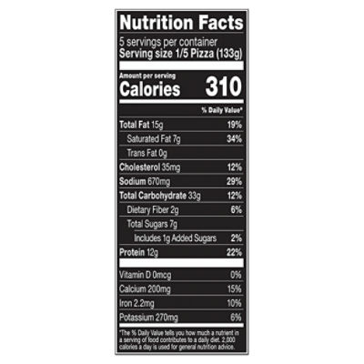 Nutrition Facts for Jack's Original Supreme Pizza - MyFoodDiary Original Supreme Pizza Nutrition Facts Serving Size pizza 1/3 pizza = 120g Amount Per Serving 370 Calories % Daily Value* 28% Total Fat 18g 40% Saturated Fat 8g Trans Fat 0g 13% Cholesterol 40mg 32% Sodium 730mg 12% Total Carbohydrate 35g 7% Dietary Fiber 2g Sugars 3g Protein 17g 19% Calcium 250mg 15% Iron 2.7mg 3% Vitamin A 30mcg 7% Vitamin C 6mg