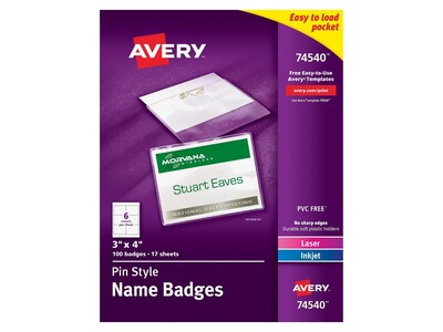 Avery Laser and Inkjet 3" x 4" Pin Name Badges 100pk - 74540 - MyBinding Your Price: $73.29 Avery Laser and Inkjet Clip Name Badges Avery Laser and Inkjet 3" x 4" Pin Name Badges 100pk - 74540 Part #: AVE-74540 Brand: Avery Pin securely holds badge in place Safely adheres to most woven and knit fabrics Includes 100 PVC-free pin badge holders and 100 name badge inserts Inkjet and laser compatible
