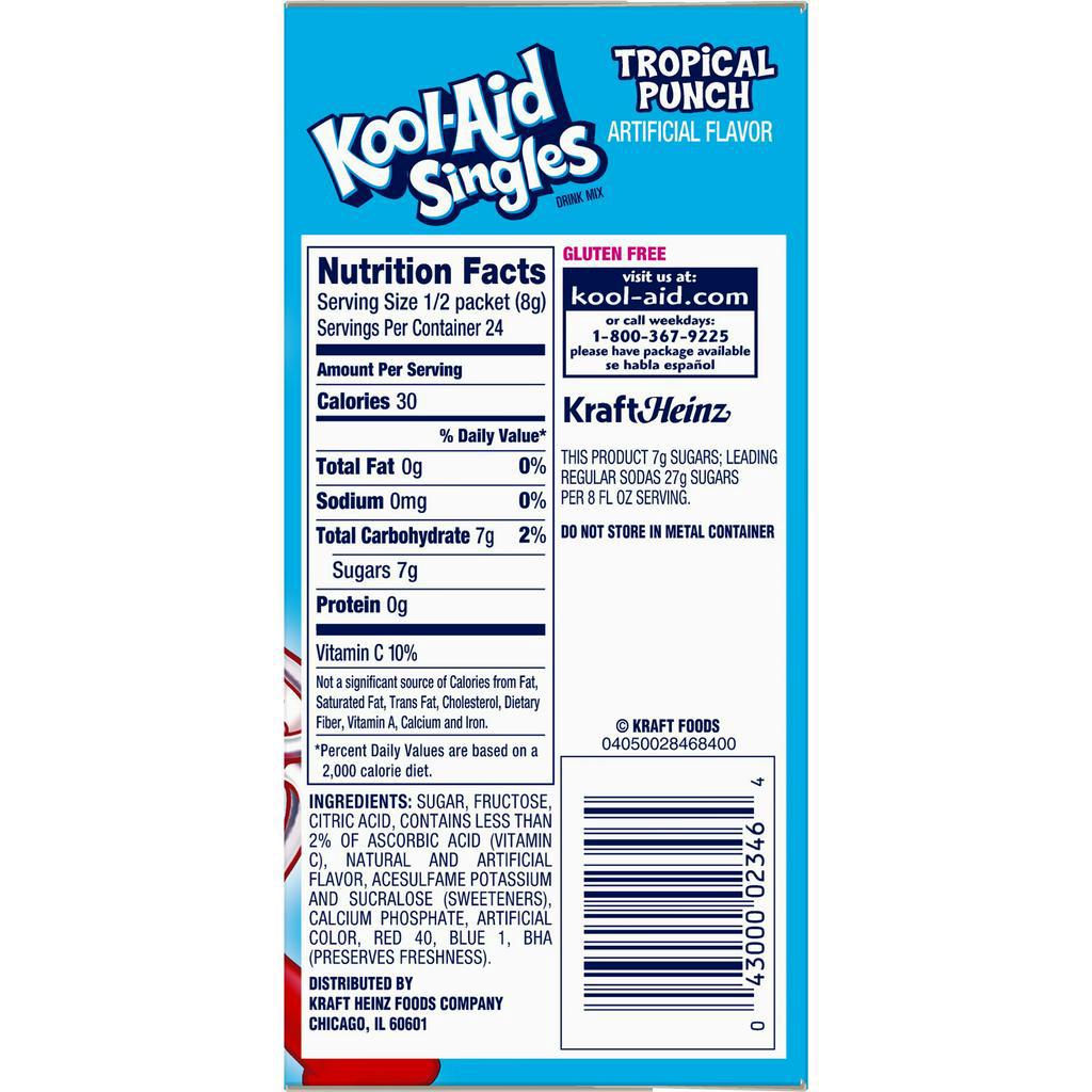 Kool Aid - Nutrition Facts - recipal.com Nutrition facts label and information for Kool Aid - Per 100 grams: 0.0 calories, 0.0g fat, 0.0g carbohydrate, 0.0g protein. Kool-aid Tropical Punch Drink Mix Unsweetened 0.16 Oz Packet Nutrition Amount Per Serving. Calories . 0 Calories From Fat. 0 % Daily Value* Total Fat 0G. 0%. Saturated Fat 0G. 0%. Trans Fat 0G. Cholesterol 0MG. 0%. ... So Many Ways to Enjoy Kool-Aid. Flavorful fun made easy - available in a rainbow of flavors! So Many Ways to Enjoy Kool-Aid. Flavorful fun made easy - available in a rainbow of flavors! KoolAid Nutrition Facts, Ingredients, Calories, Health Risk Koolaid Nutrition Facts of Different Size and Flavor. Kool-aid, 16 oz x 4=64 oz. Calories: 120 •Carbs: 48g •Fat: 0g •Protein: 0g. Kool Aid, 1 packet. Kool-Aid Jammers Tropical Punch Flavored Drink 60 fl oz Box (10-6 fl oz ... Kool-aid 0.6 Oz Soft Drink-powdered Sugar Free Tropical Punch 1 X 10ct Box/carton Inner Pack. Kool-aid Tropical Punch Drink 96 Fl. Oz. Bottle. Kool-aid Tropical Punch Drink Mix 82.5 Oz. Canister. Kool-aid Singles Tropical Punch Soft Drink Mix 0.55 Oz Packet. Kool-aid Sf Otg Tropical Punch Single.