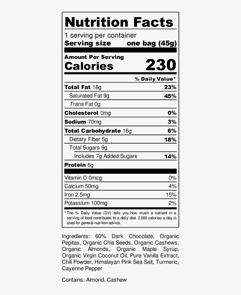Nutrition Facts Label Guide | Food Labels | Custom Label Blog The Nutrition Facts label uses 6 point or larger Helvetica Black and/or Helvetica Regular type. In order to fit some formats, the typography may be kerned as much as -4. Any tighter kerning will reduce legibility. Key nutrients and their percentage of Daily Value are set in 8 point Helvetica Black (but "%" is set in Helvetica Regular). DOVE® PROMISES® Dark Chocolate 0% Total Carbohydrate 19g 7% Dietary Fiber 2g 7% Total Sugars 15g Includes Added Sugars 15g 30% Protein 2g Vitamins | Minerals: % Daily value Vitamin D 0mcg 0% Calcium 0mg 0% Iron 1.2mg 6% Potassium 250mg 6%