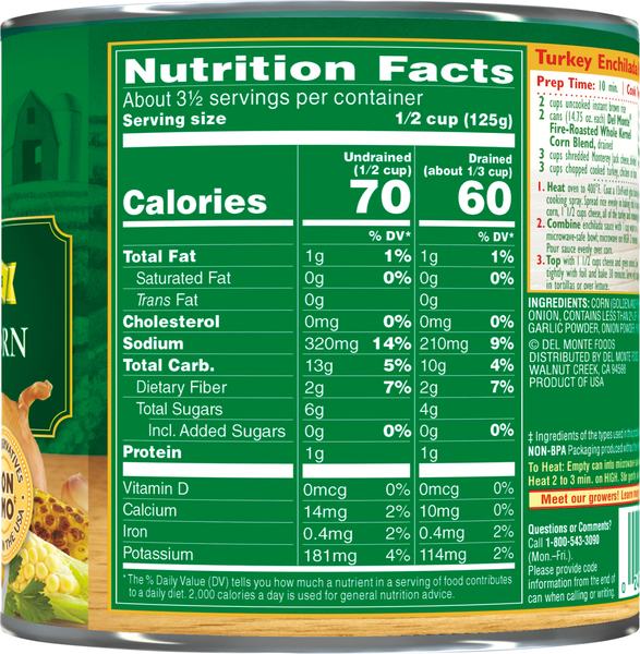 Canned corn nutrition label. FoodData Central WebThe .gov means it’s official. Federal government websites always use a .gov or .mil domain. Before sharing sensitive information online, make sure you’re on a .gov or .mil site by inspecting your browser’s address (or “location”) bar. Uno Pizzeria & Grill: Nutrition WebAll nutritional information is derived from a computer analysis of recipes with the help of Genesis R&D Food Formulation & Labeling Software, Version 9.12.1, from ESHA Research in Salem, Oregon, and data provided by the suppliers of our food items.The nutrition information provided is based on standard recipes that may vary based on portion size, … Food and Recipes Center: Easy, Healthy Recipe Ideas for Your … WebThe USDA has simplified nutrition guidelines with its "MyPlate" campaign. MyPlate replaces the older Food Pyramid that many adults grew up with. 10 of the Best Canned Foods for Healthy Meals Web21/07/2021 · Nutrition. Baby corn is fat-free and very low in calories and carbs. For instance, there are only 3 grams of carbs in 3.5 ounces (100 grams) of baby corn . Uses. Baby corn is a perfect fit for ...